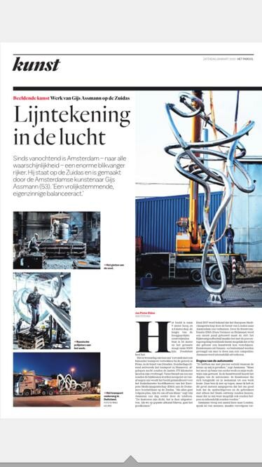 Sinds vanochtend is Amsterdam – hoogstwaarschijnlijk – een enorme blikvanger rijker. Het beeld is ruim 9 meter hoog en 4,5 meter diep, de lengte van de hooggepolijste roestvrijstalen buis is 54 meter en het gevaarte weegt ruim 9000 kilo. Het staat op de Zuidas, heet Pendulum en is gemaakt door de Amsterdamse kunstenaar Gijs Assmann (53). “Het was een prestigieuze, maar logistiek complexe opdracht.”